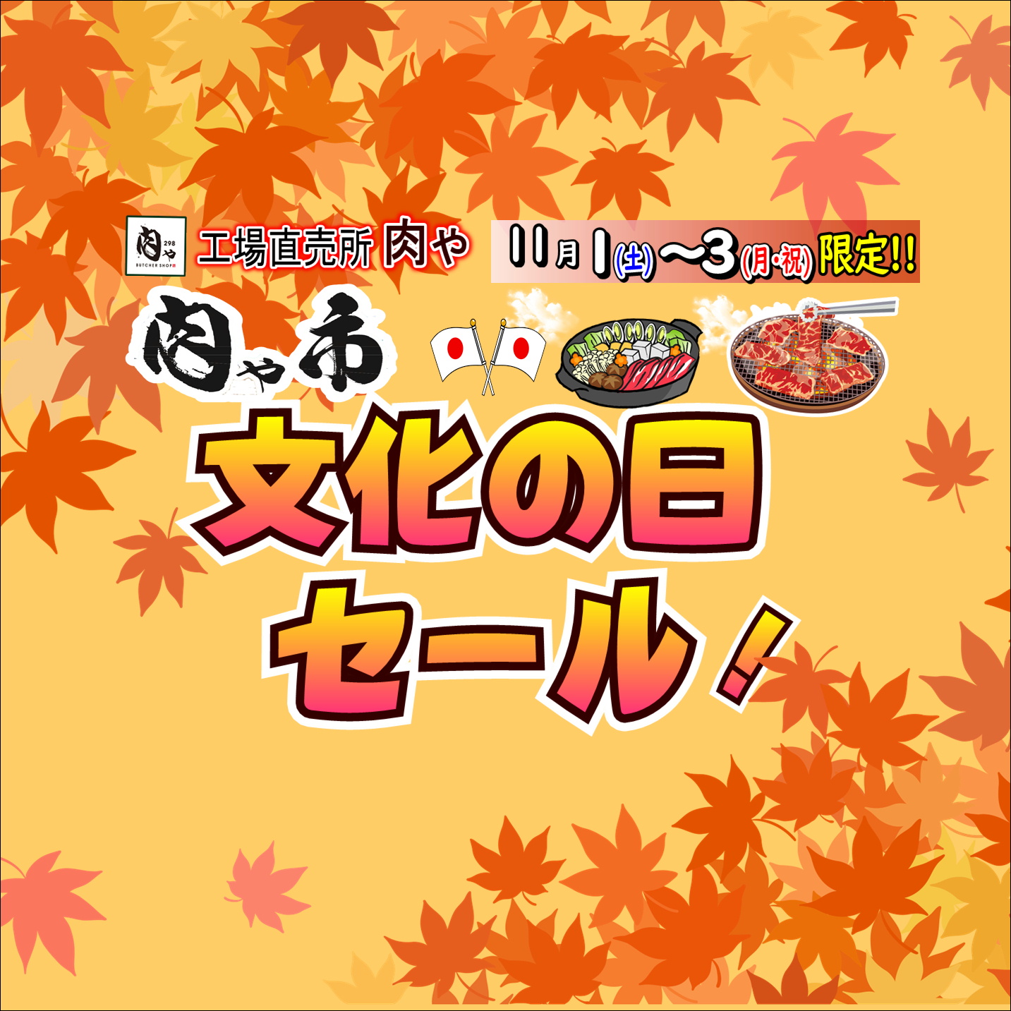 - 工場直売所「肉ゃ」11/1(土)~11/3(月・祝)「肉ゃ市!文化の日セール!」開催‼ 毎週土曜・日曜は大変お得な肉ゃ市開催!(*^▽^*)/