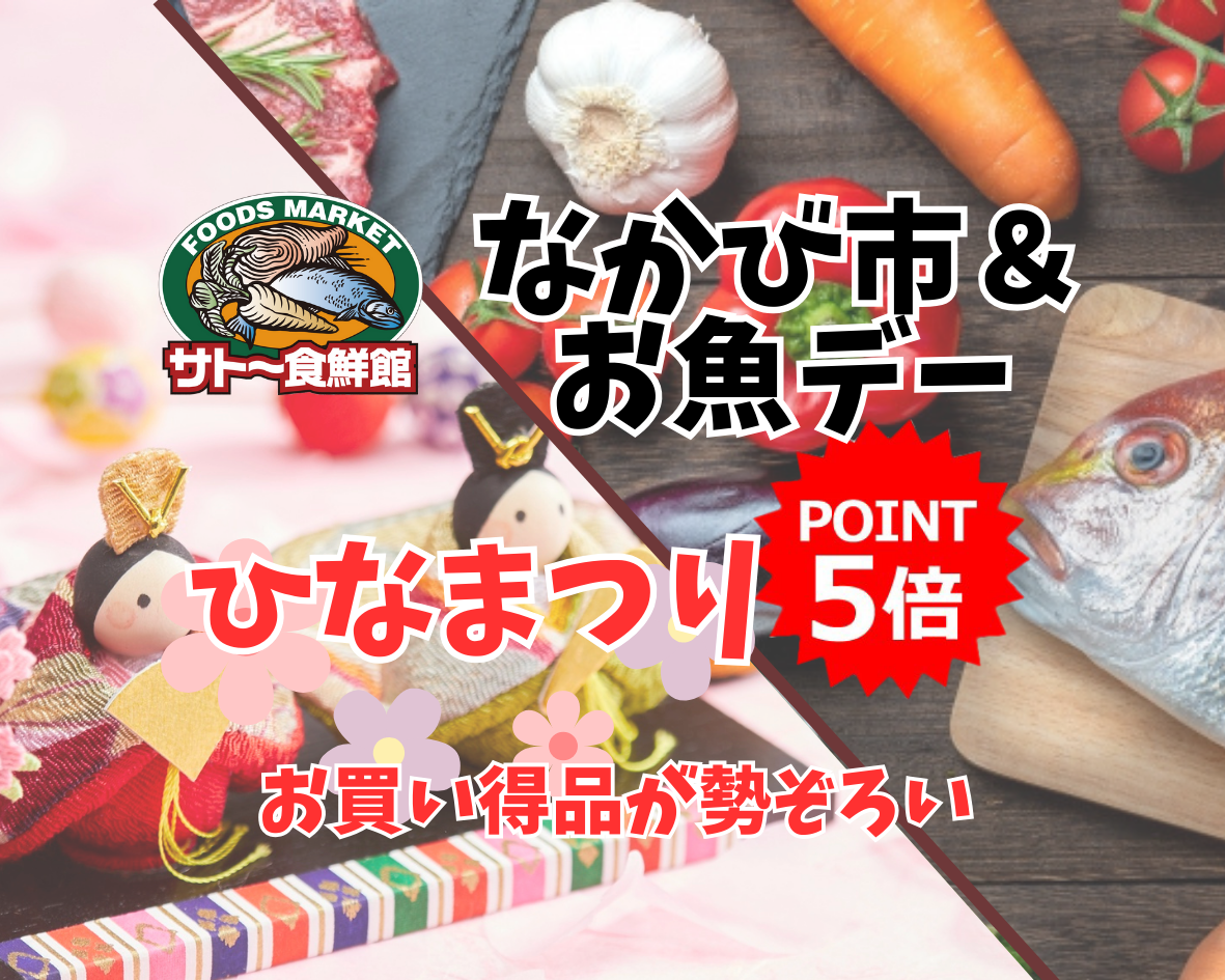 - 2/25(水)はなかび市&お魚デー、本日ポイント5倍!~ひなまつり、HOME PARTY~
