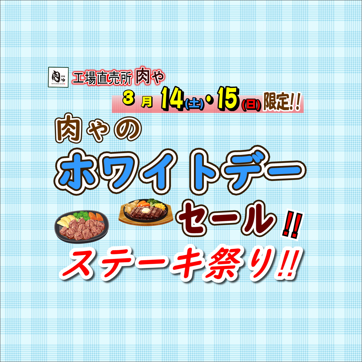 - 工場直売所「肉ゃ」3/14(土)・3/15(日)限定!「肉ゃのホワイトデーセール!」開催‼ 毎週土曜・日曜は大変お得な肉ゃ市開催!(*^▽^*)/