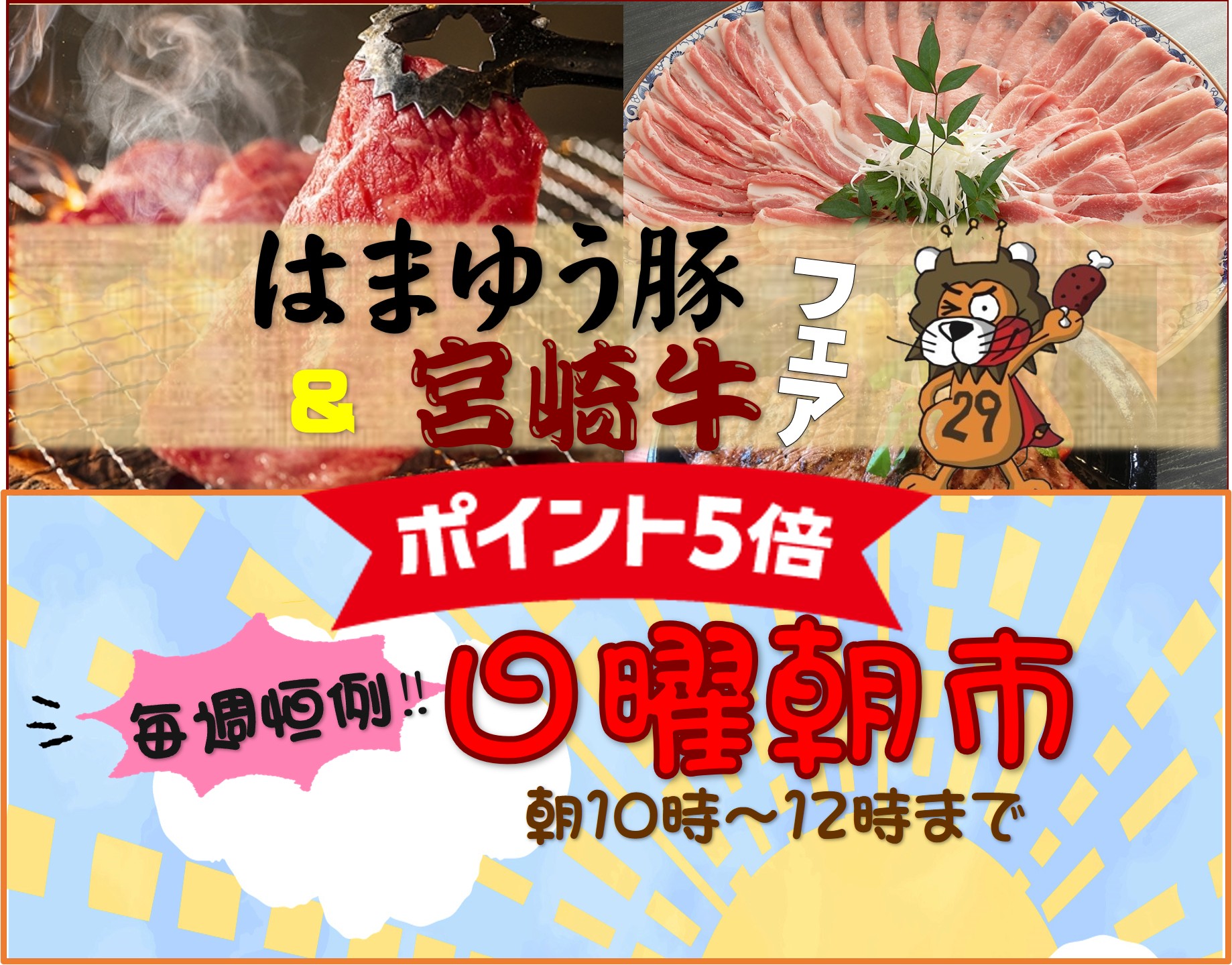 - 3/29(日)は月に一度の「肉の日」開催!さらに、毎週恒例の「日曜朝市🌞」同時開催!本日ポイント5倍!~宮崎はまゆう豚・宮崎牛フェア、宮崎のてげうめぇもん大集合!