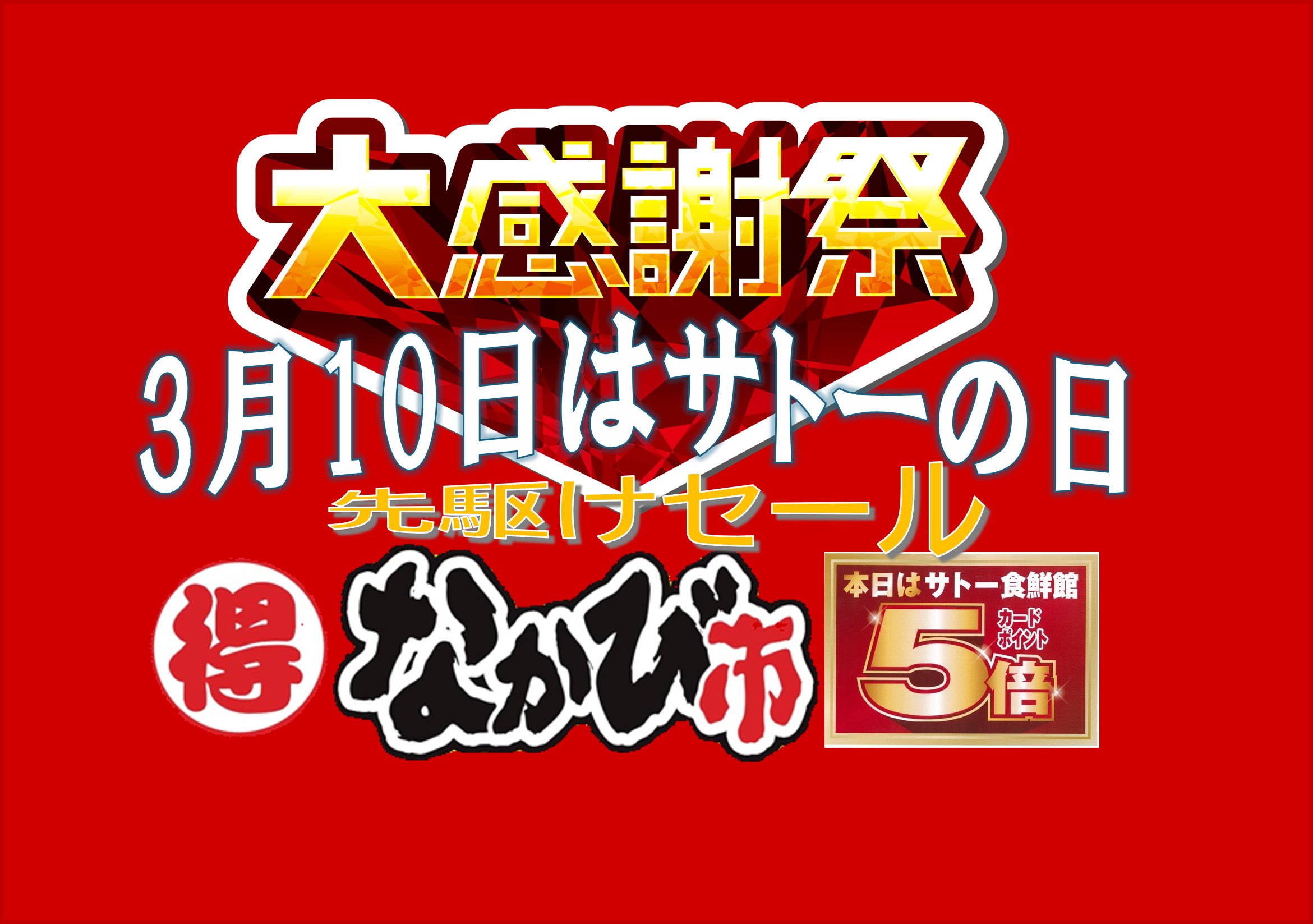 - 3/4(水)はなかび市&お魚デー、今週は先駆けサトーポイントアップウィーク!本日5倍~3月10日はサト~の日、年に一度の大感謝祭開催‼