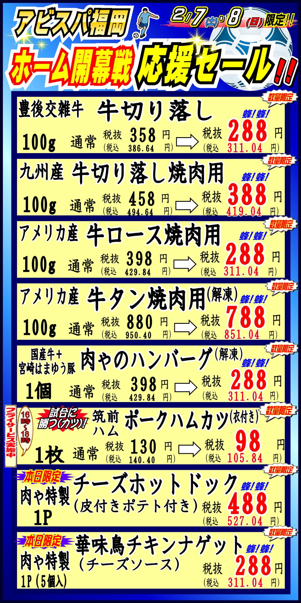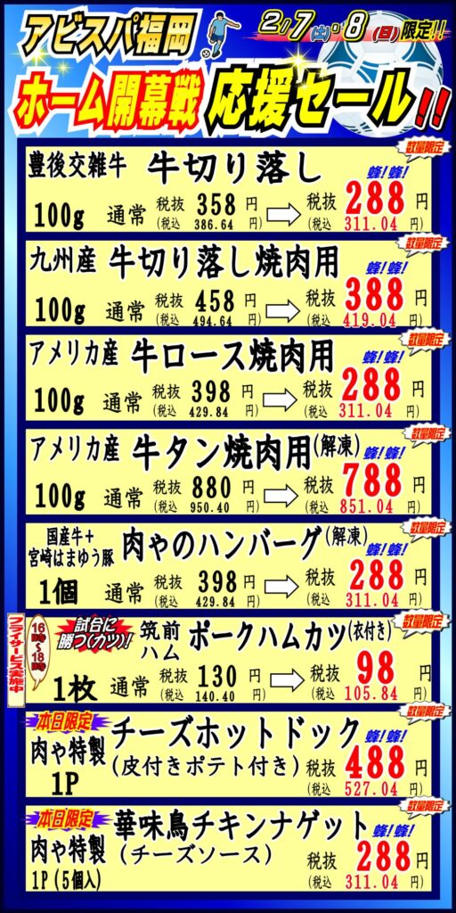 毎週土日は「肉ゃ市」♪2/7(土)・8(日)は「アビスパ福岡⚽ホーム開幕戦応援セール」開催!!