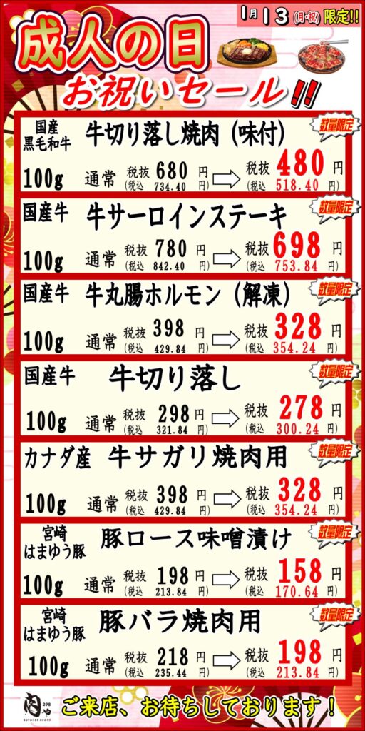 工場直売所「肉ゃ」成人の日♪ 1/12(月・祝)限定!「成人の日 お祝いセール」開催!!