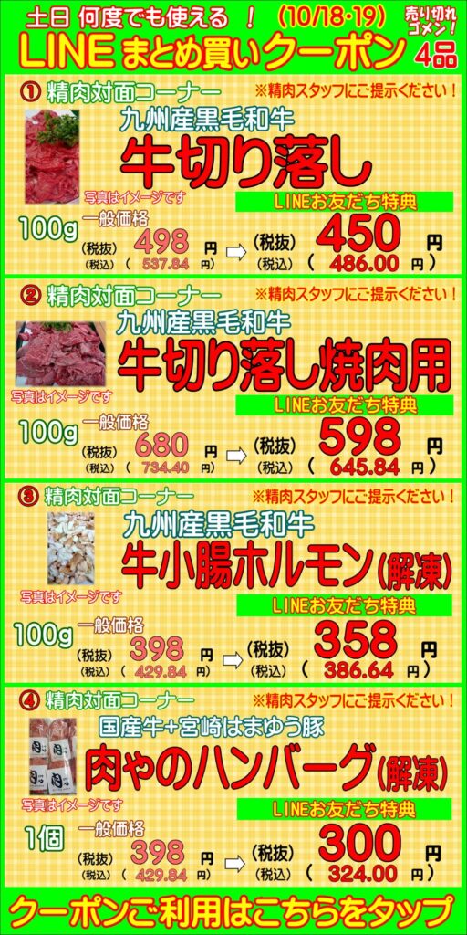 今週は10/18(土)・19(日)に何度でも使える「LINEクーポン」配信!!