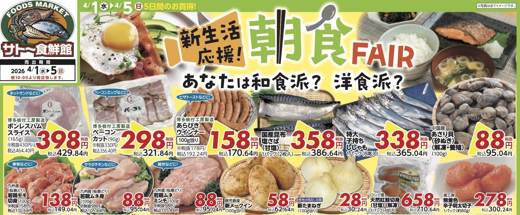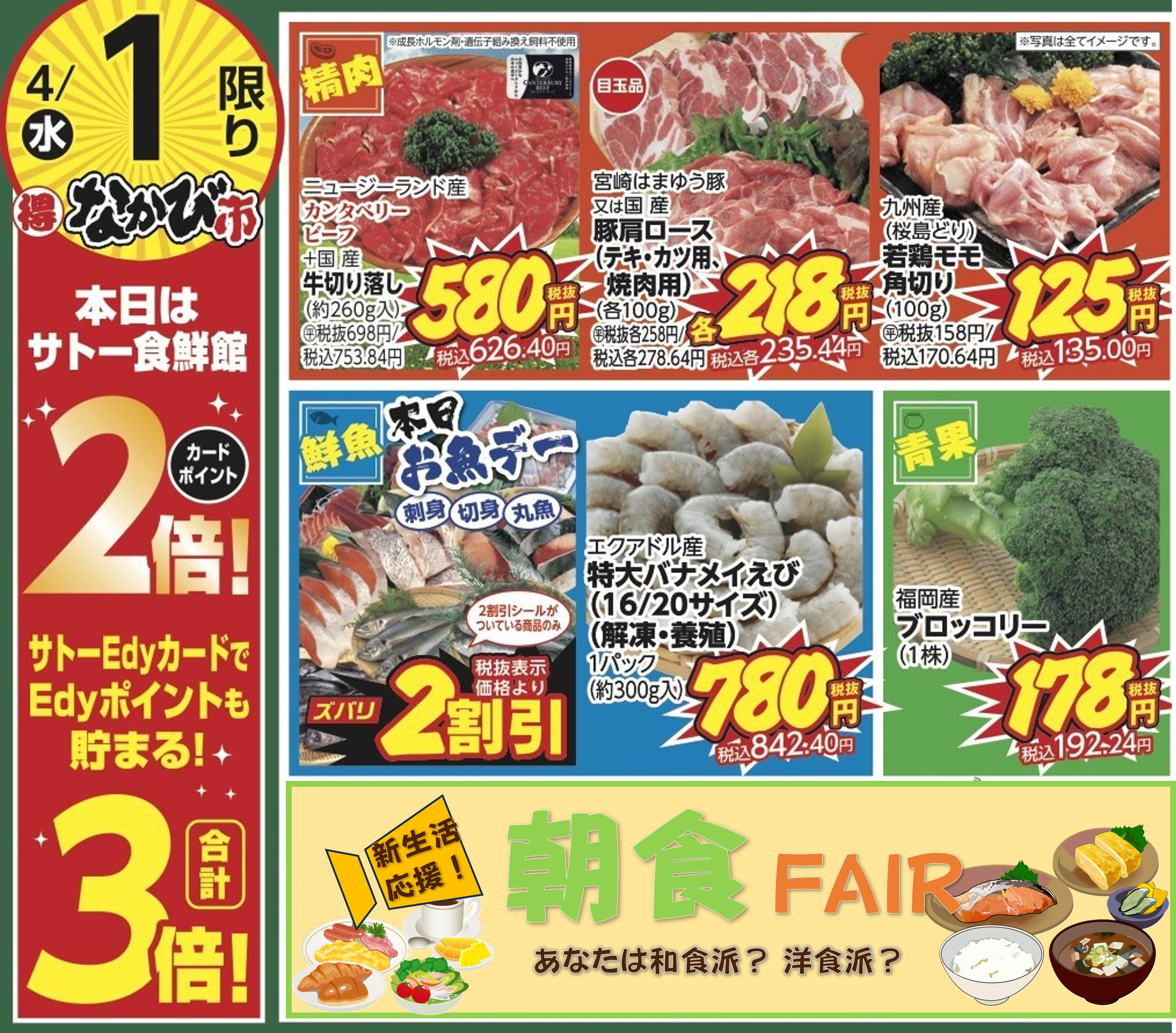 4/1(水)なかび市&お魚デー!!本日ポイント2倍!!~新生活応援!朝からしっかり栄養補給♪朝食フェア~