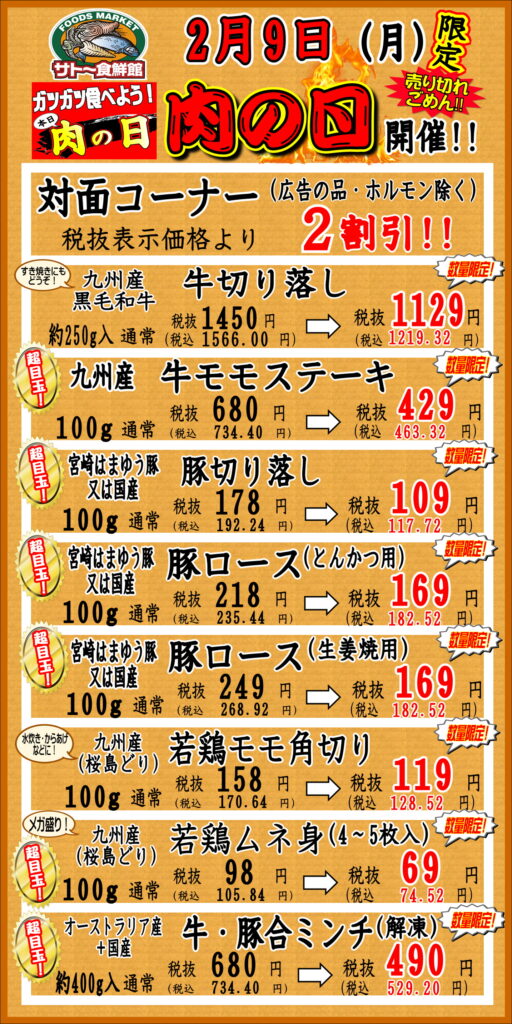 2/9(月)サト~食鮮館『肉の日』\( ‘ω’)/対面コーナー2割引!!