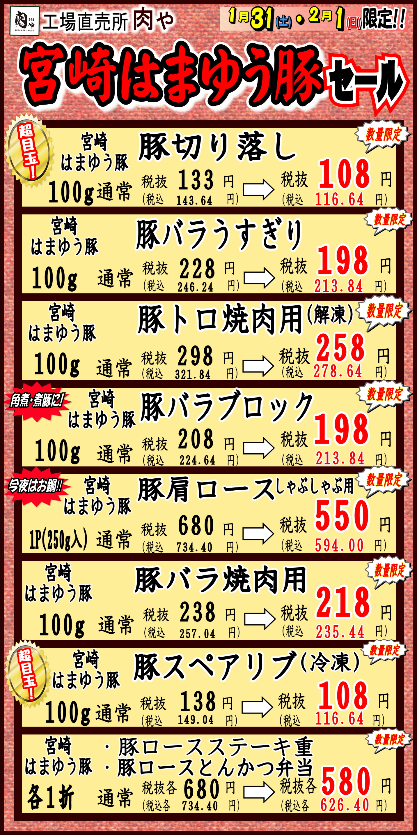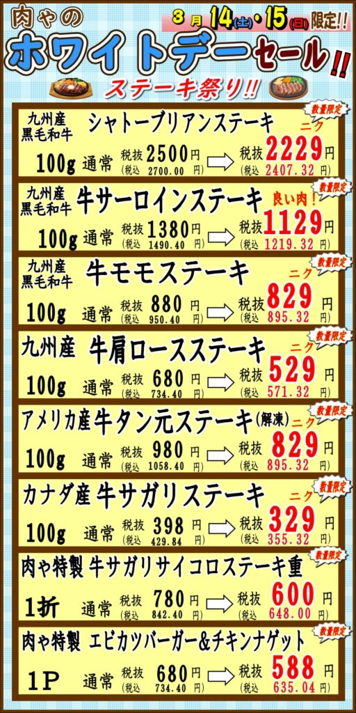 工場直売所「肉ゃ」3/14(土)・3/15(日)限定!「肉ゃのホワイトデーセール!」開催‼ 毎週土曜・日曜は大変お得な肉ゃ市開催!(*^▽^*)/