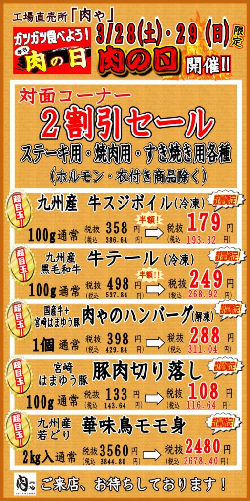 工場直売所「肉ゃ」の「肉の日」‼今月は28日(土)、29日(日)の2日間開催‼