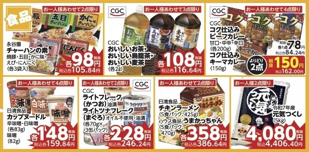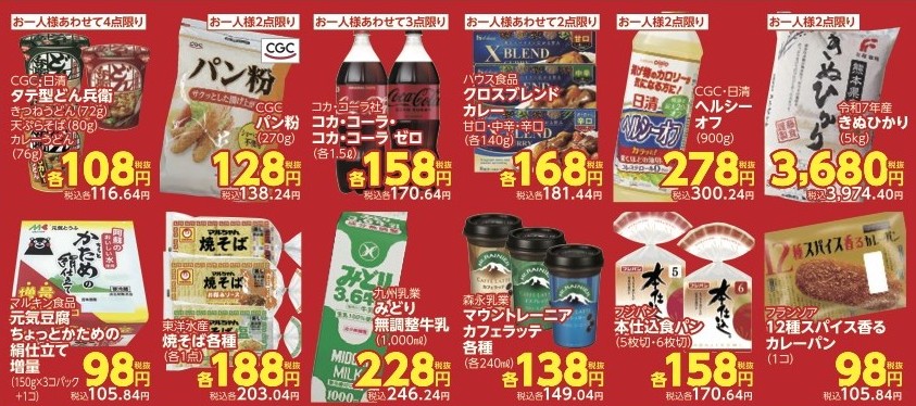 ✅CGC・日清 タテ型どん兵衛 きつねうどん(72g)天ぷらそば(80g)カレーうどん(76g)税抜各108円(税込各116.64円)お一人様あわせて4点限り