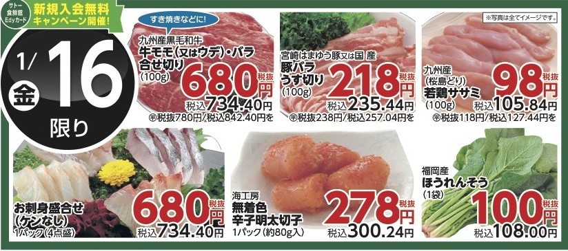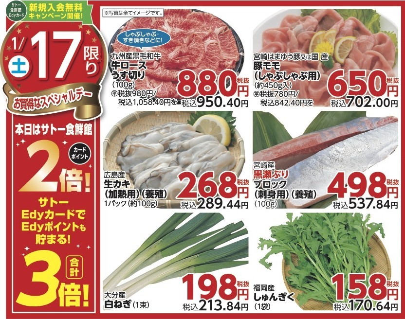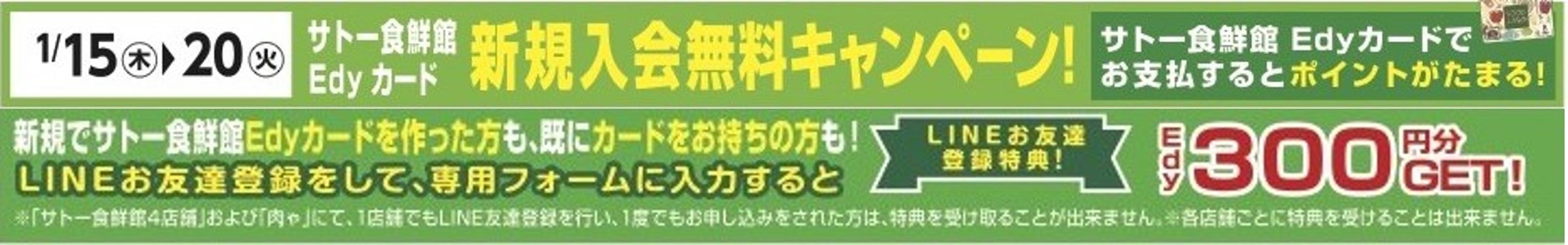 1/15(木)~1/20(火)はサトー食鮮館Edyカードが入会無料に...!!