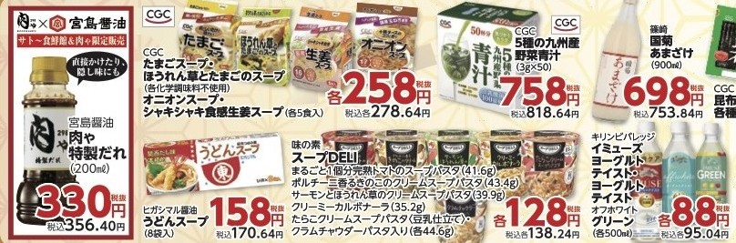 ✅CGC たまごスープ・ほうれん草とたまごのスープ(各化学調味料不使用) オニオンスープ・シャキシャキ食感生姜スープ(各5食入)税抜各258円(税込各278.64円)