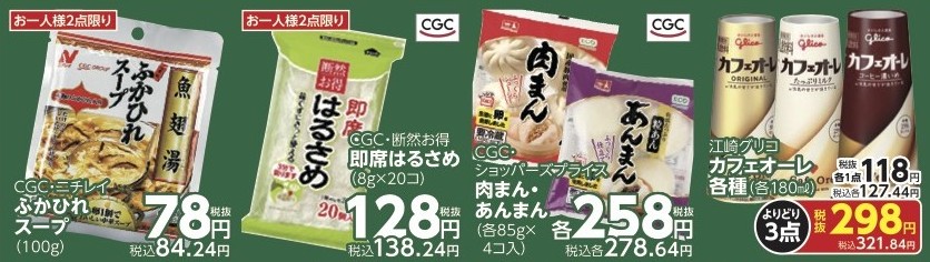 CGC・ショッパーズプライス 肉まん・あんまん(各85g×4コ入) 税抜各258円(税込各278.64円)