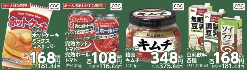 CGC・ショッパーズプライス 完熟カットトマト・完熟ホールトマト(各400g)税抜各108円(税込各116.64円)お一人様あわせて2点限り