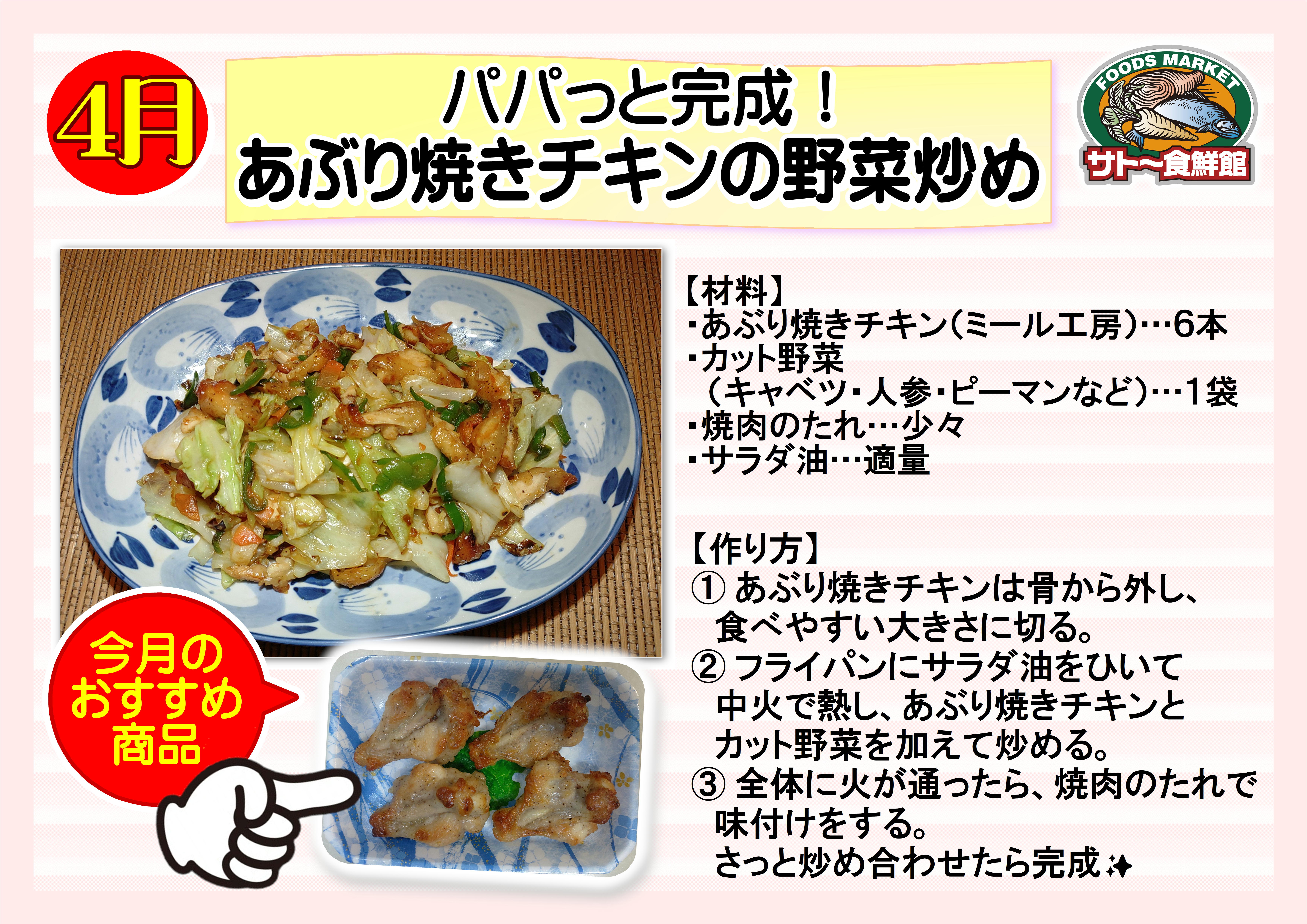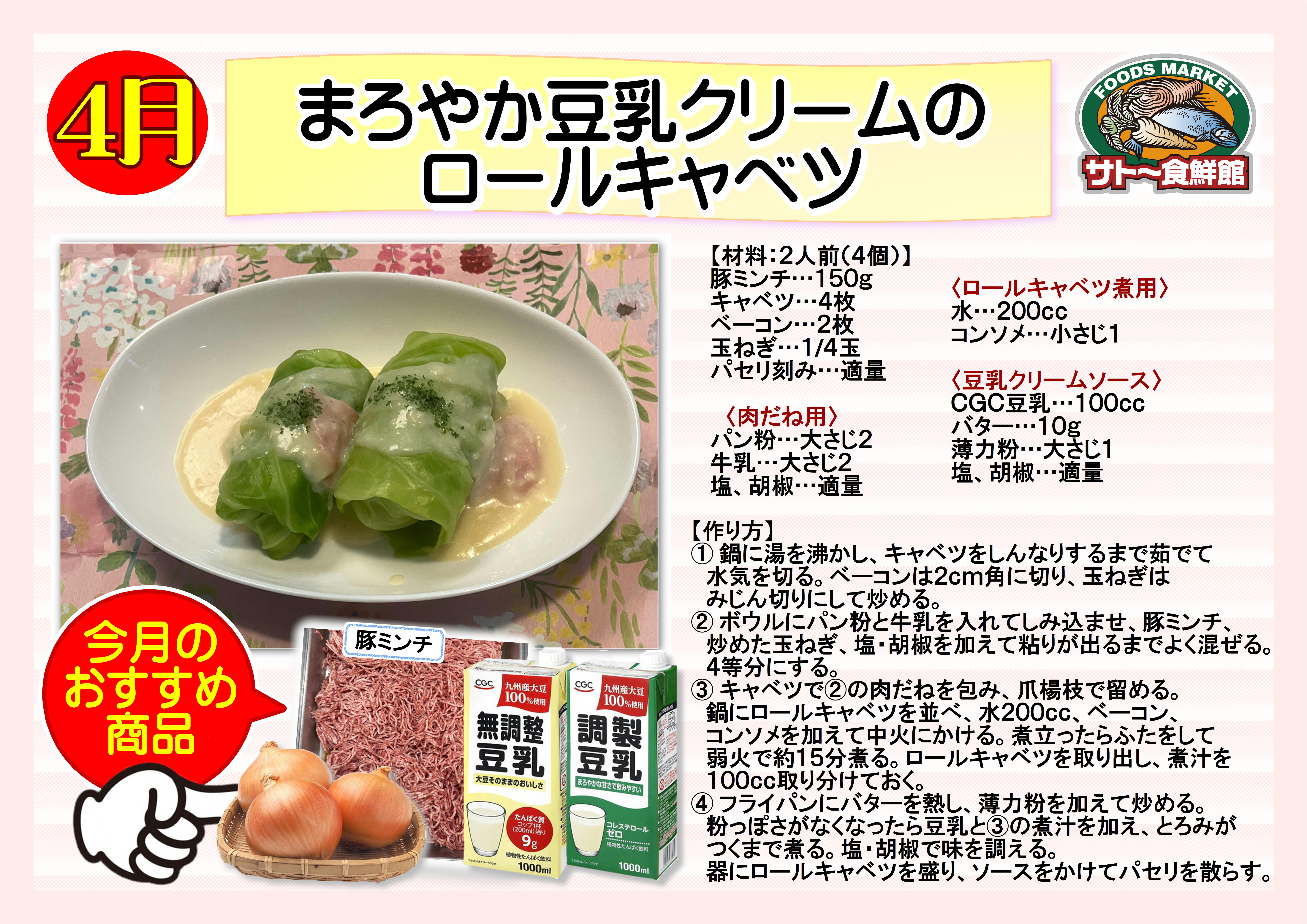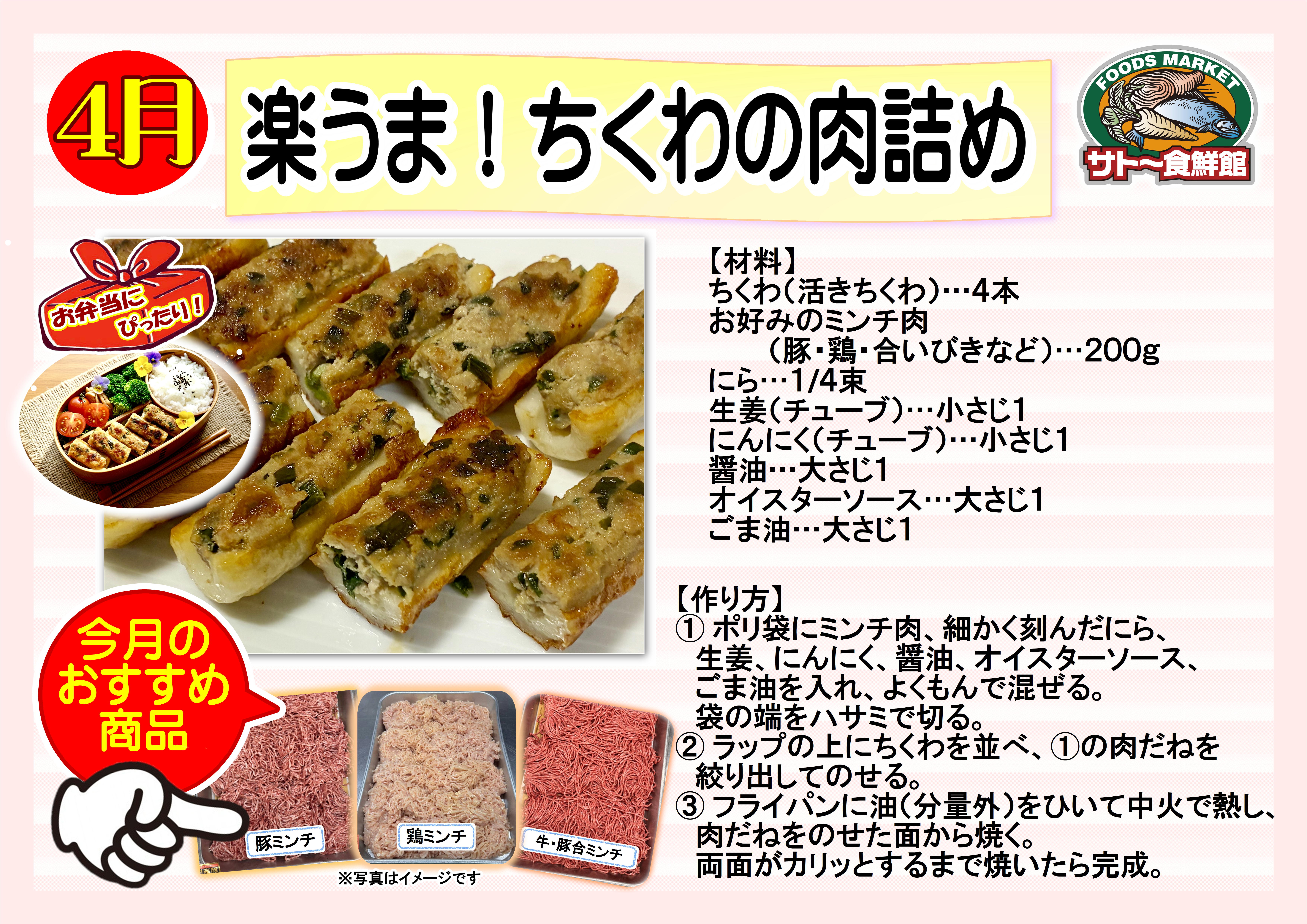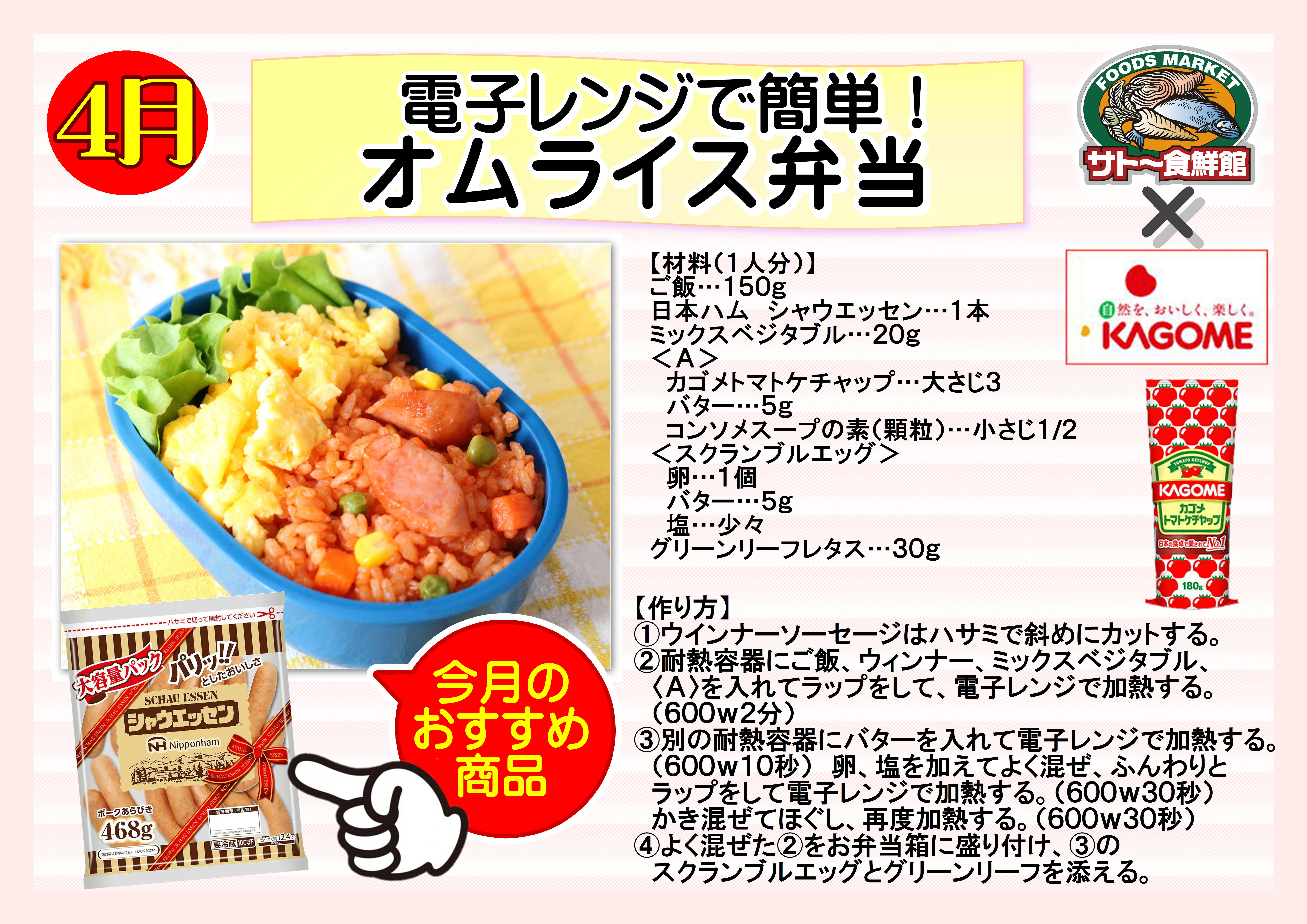 サトー食鮮館オリジナルレシピは、「今月のおすすめ商品」を使ったレシピを社員が考え、実際に作ったものを掲載しています(一部協力業者様提案レシピがあります)!