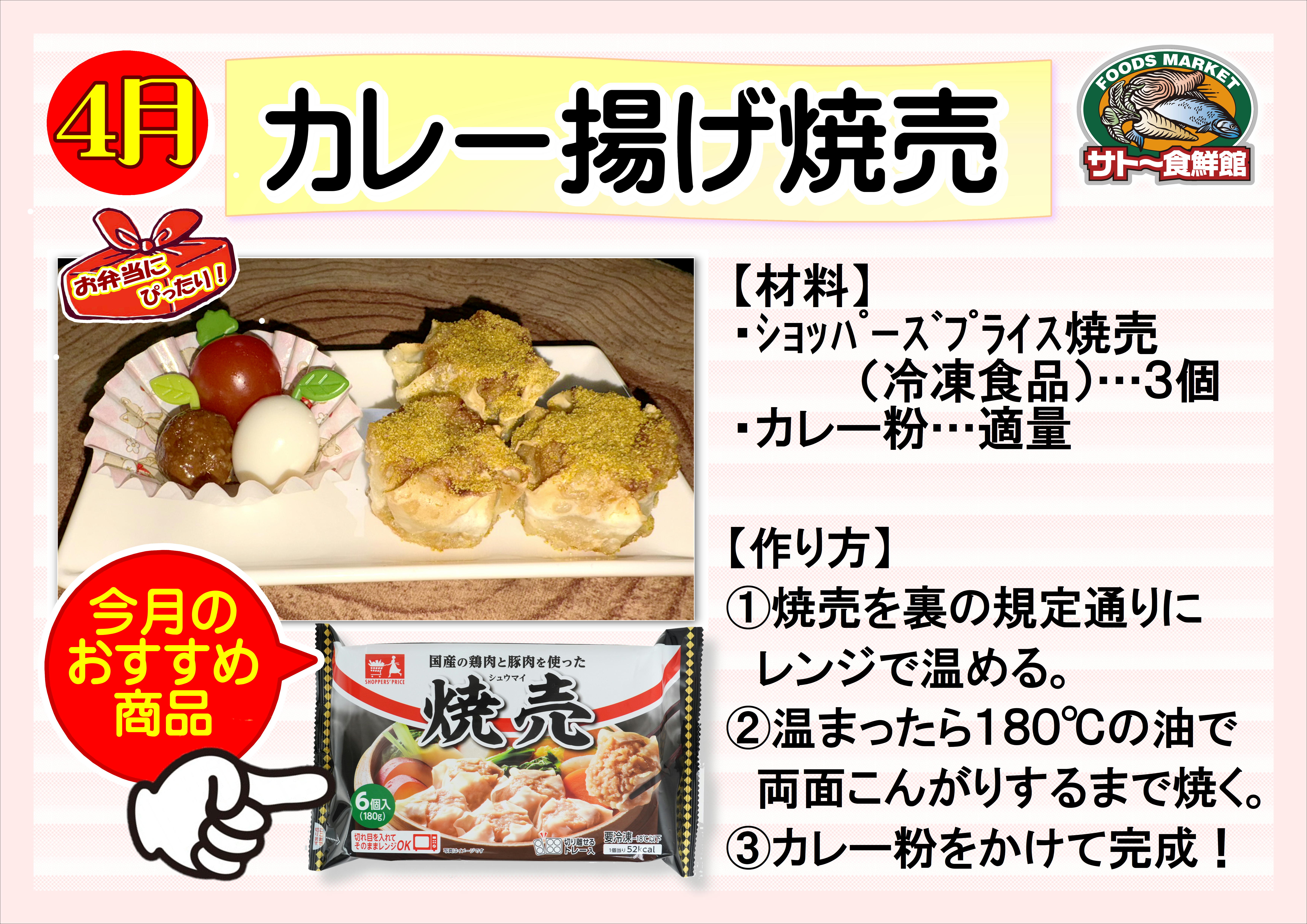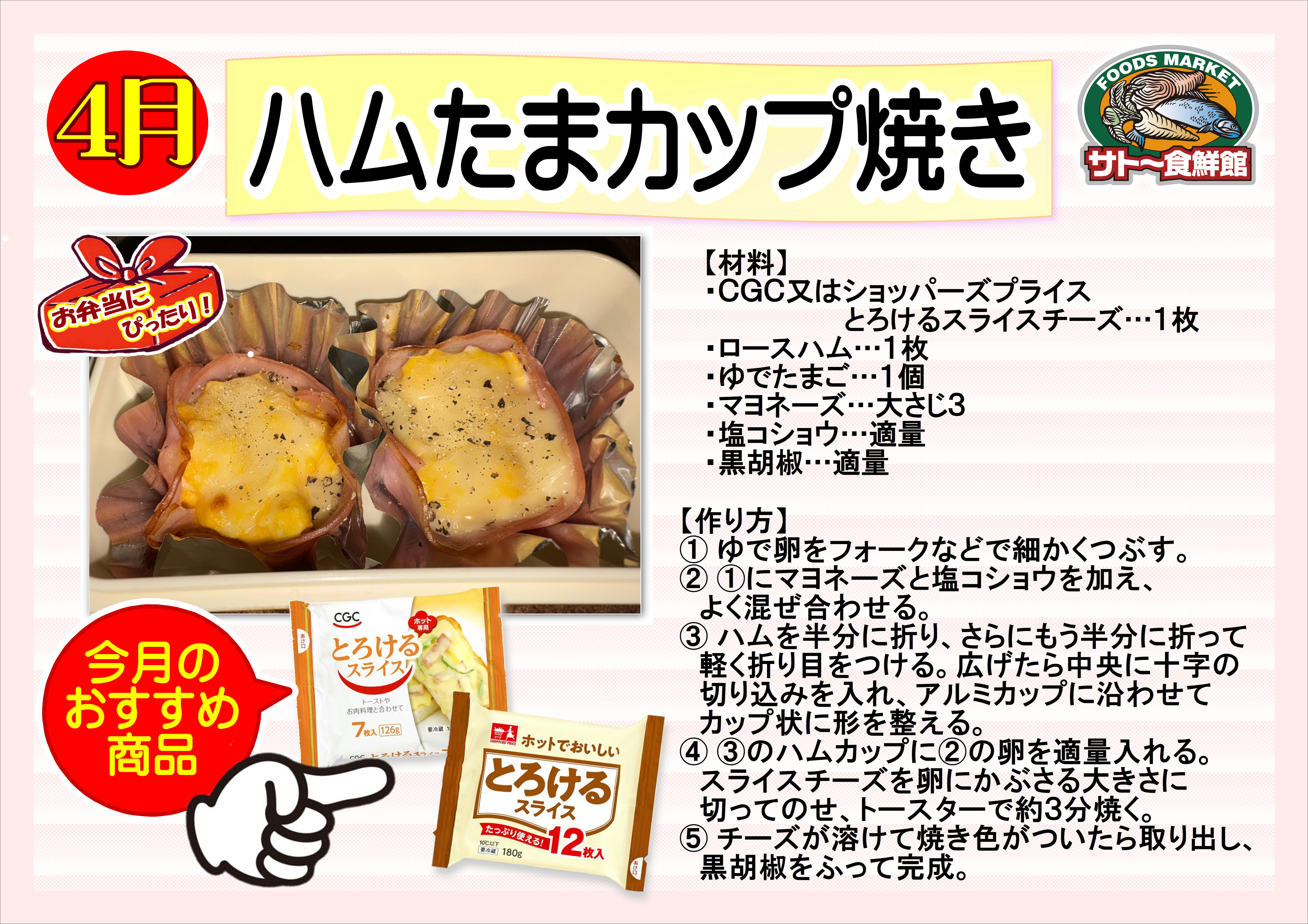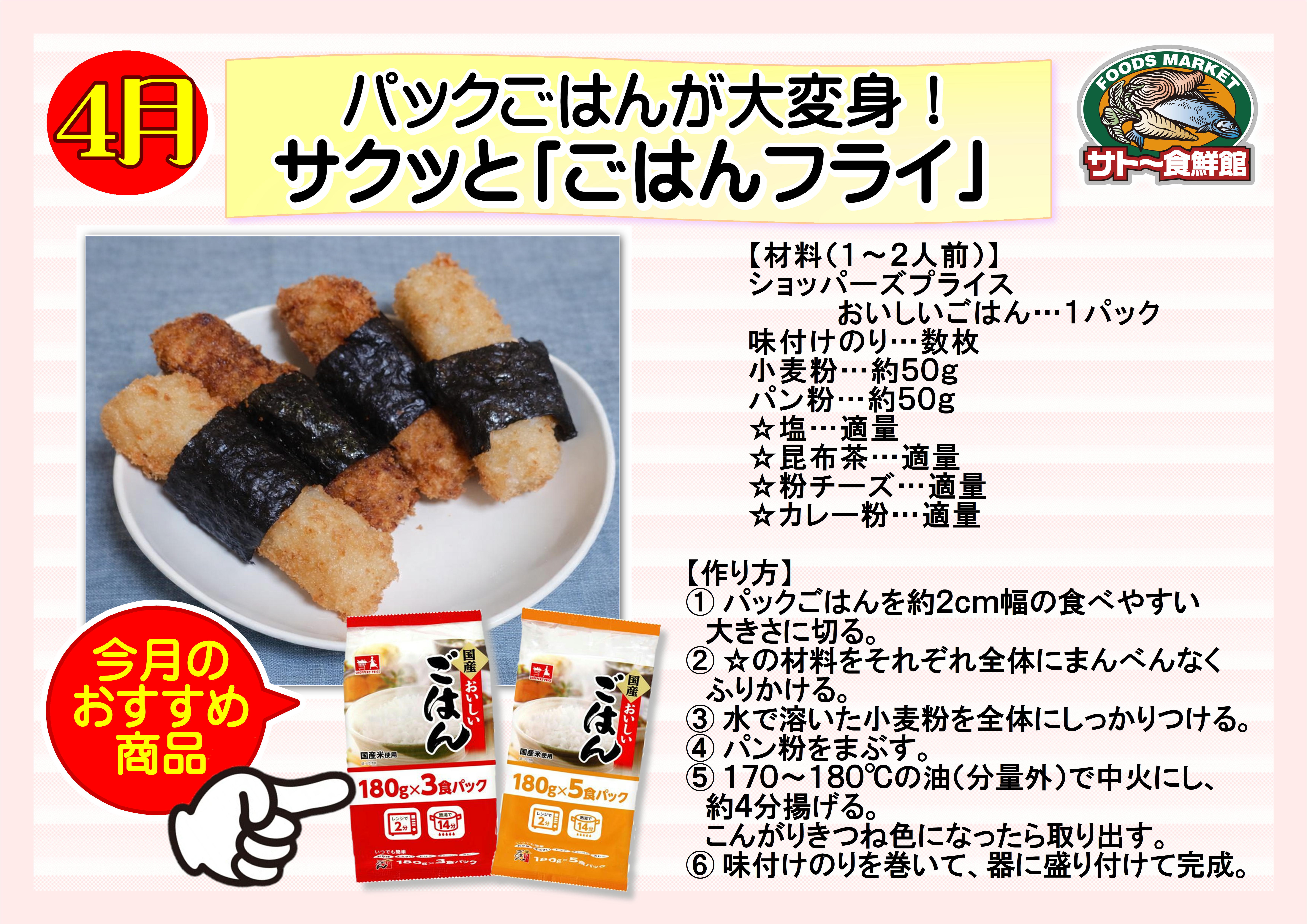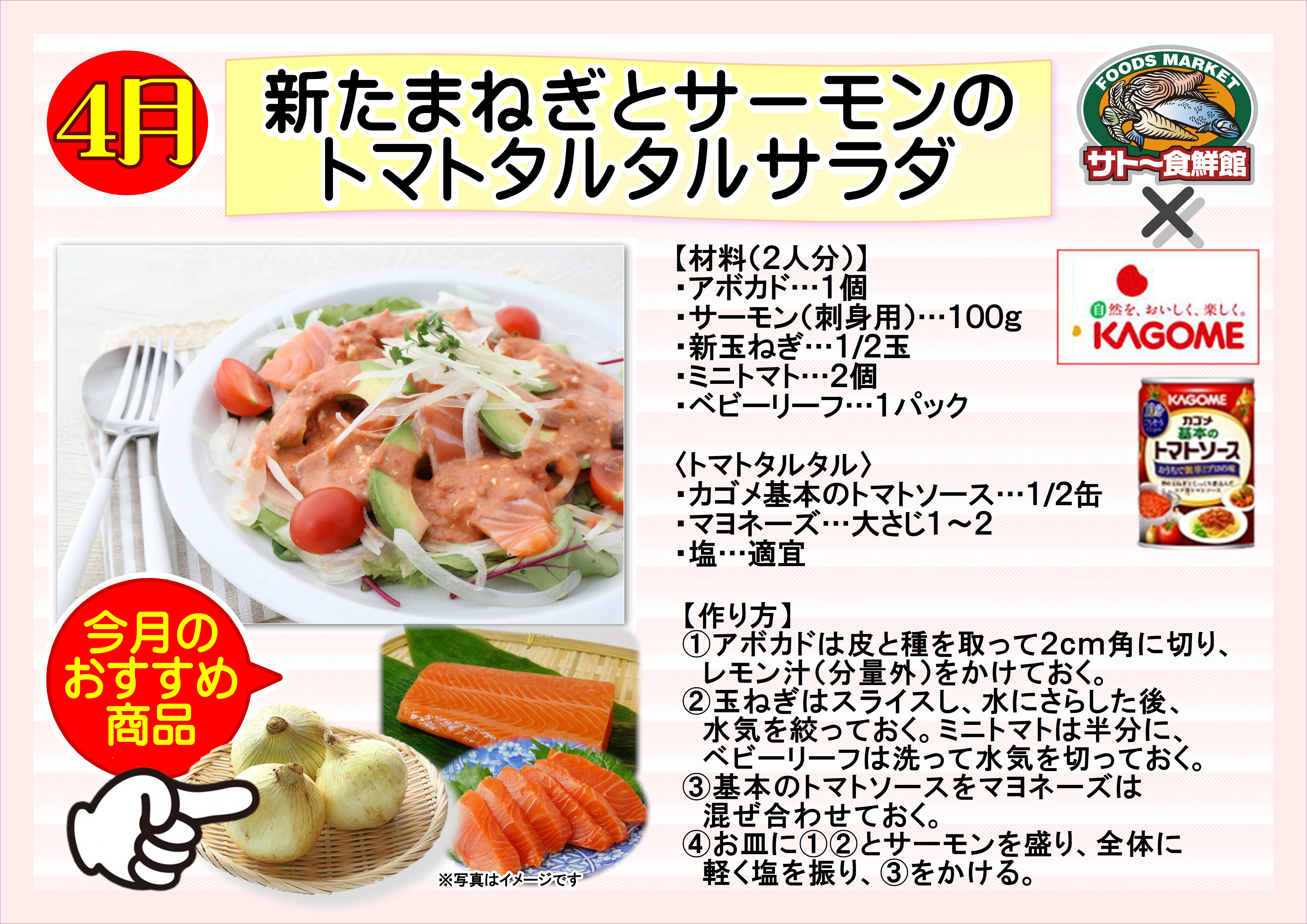 サトー食鮮館オリジナルレシピは、「今月のおすすめ商品」を使ったレシピを社員が考え、実際に作ったものを掲載しています(一部協力業者様提案レシピがあります)!